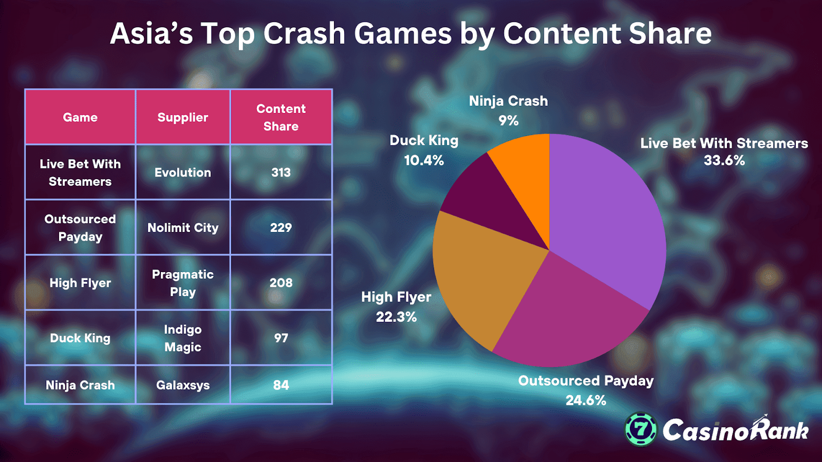 - 与主播一起进行实时投注(进化): 凭借其前沿的“直播+崩溃”混合模式,以 313% 的内容份额占据主导地位。