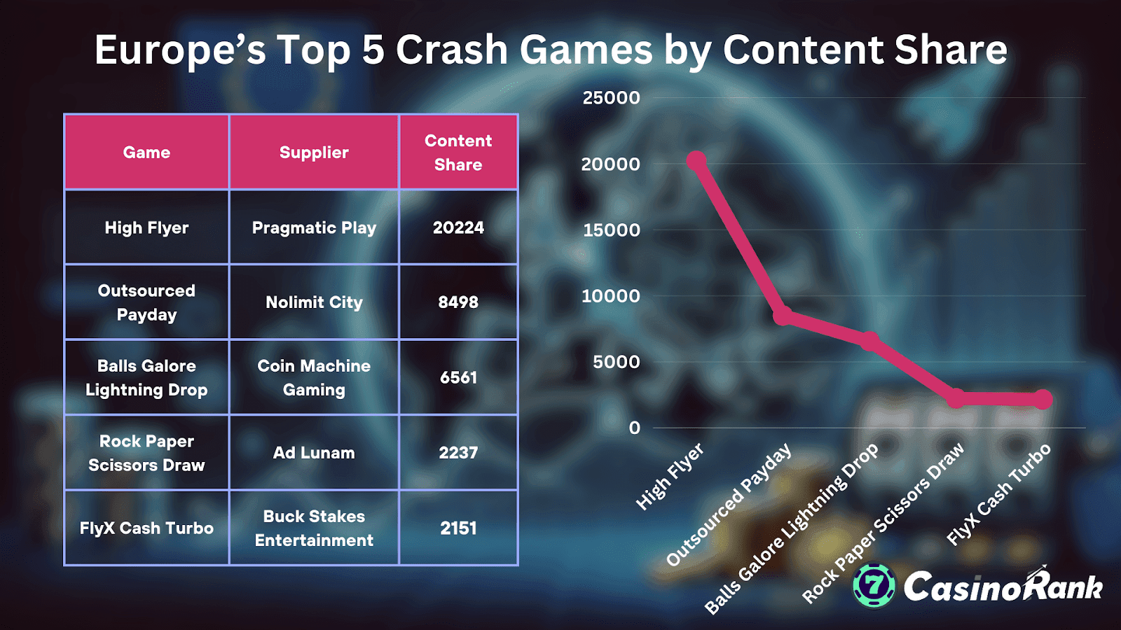 - 高飞者(实用游戏): 拥有令人印象深刻的 20,224 内容份额,这主要归功于其与赌场大厅的无缝集成和沉浸式游戏体验。