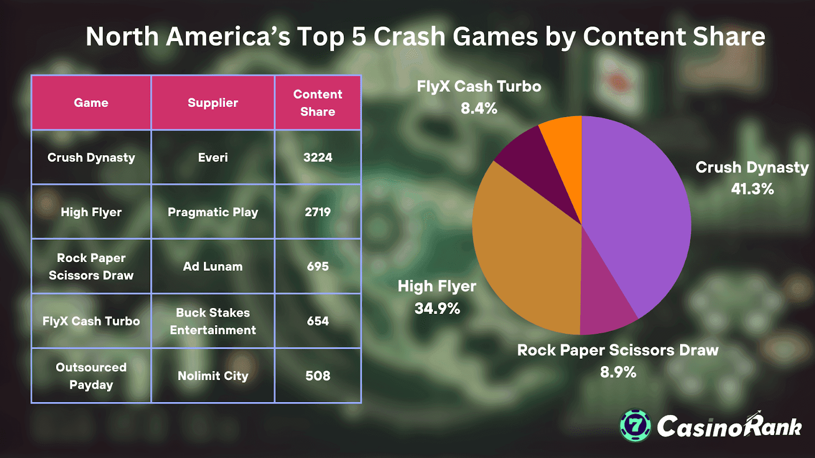 - 粉碎王朝(Everi): 以 3,224 的内容份额占据主导地位,捕捉到了快节奏、街机式乐趣的精髓。