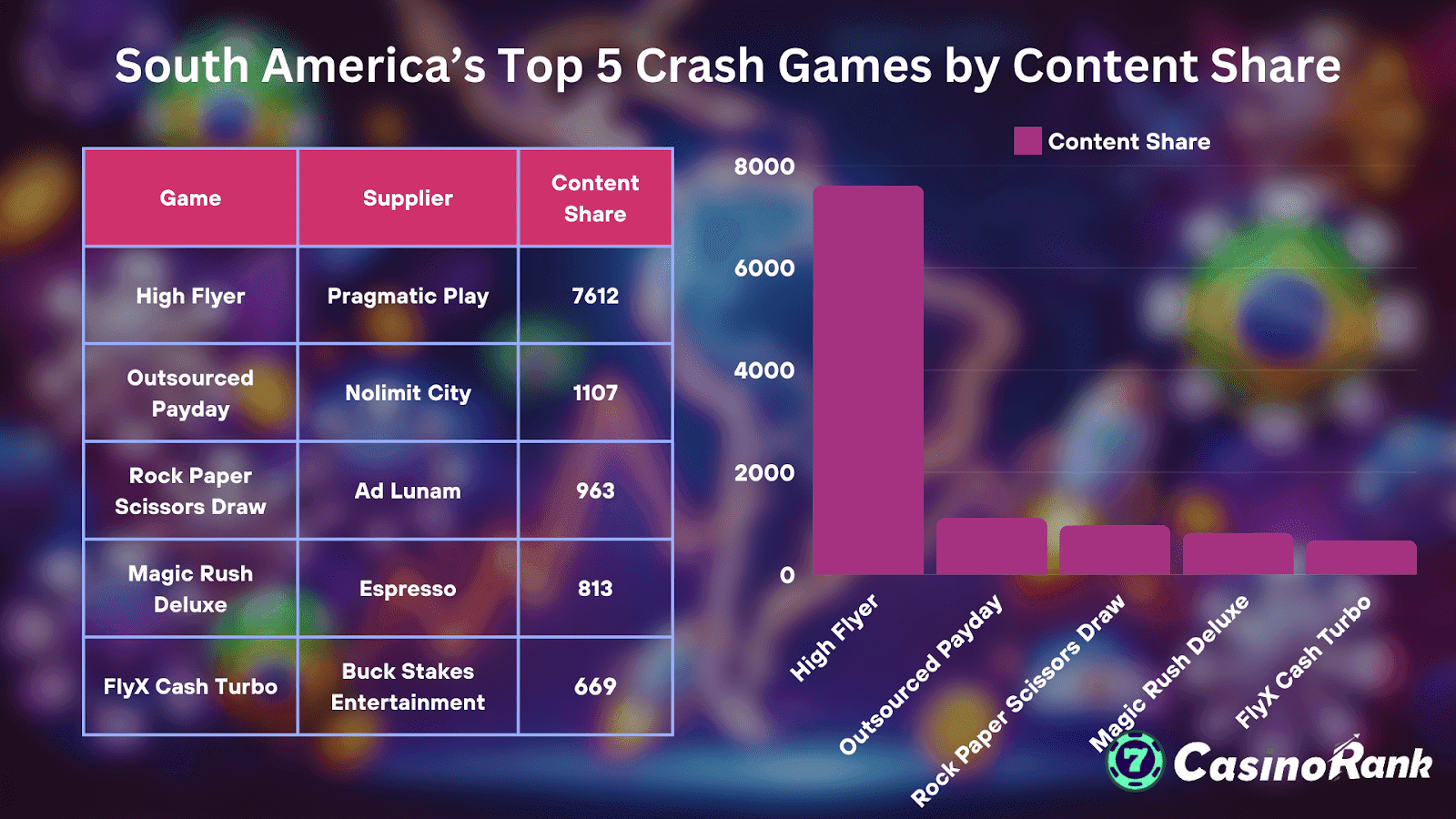 在南美洲,碰撞类游戏开辟了一片独特的市场,将创新与本土特色完美融合。Pragmatic Play 的《High Flyer》凭借广泛的发行渠道遥遥领先,这得益于其与拉美运营商建立的稳固合作关系,确保了游戏能够触达更广泛的受众。尽管《High Flyer》以其充满活力的游戏玩法占据主导地位,但 Nolimit City 的《Outsourced Payday》也取得了显著的成绩。值得注意的是,某些主题的游戏——例如 Atlas V 的足球主题游戏《Formula 1》——表现却不尽如人意,这表明该地区仍有巨大的市场潜力尚未被充分挖掘。